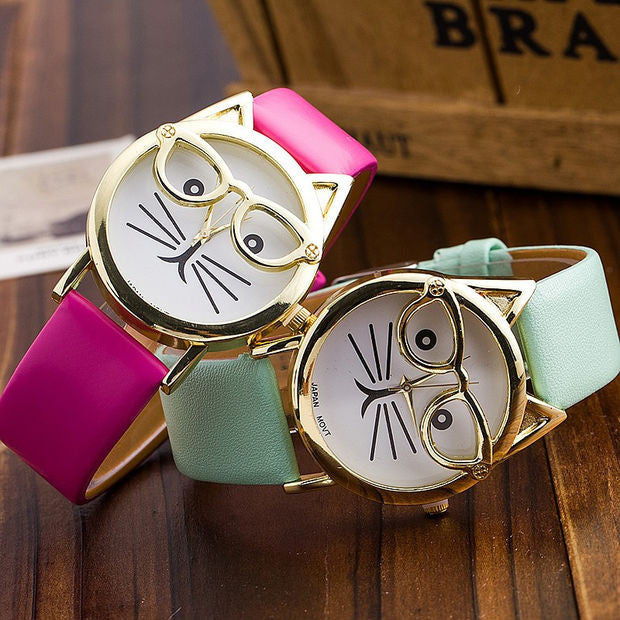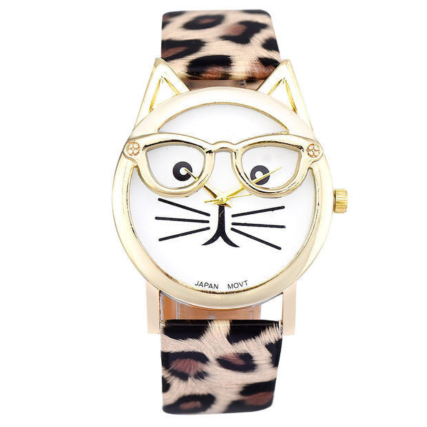 This is the cutest watch ever!!! Simple in design, lovely in style, this analog quartz wrist watch features cute cat wearing big glasses, which will make you happy when see the cute cat.